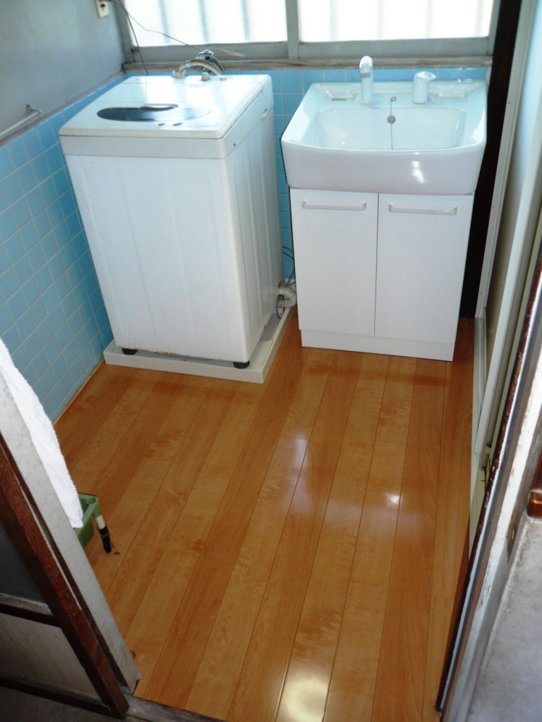 床を下地からやり替えて、洗濯機と洗面台を横並びに使いやすく整理させて頂きました。