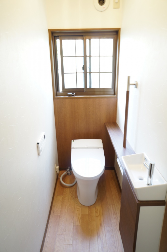 トイレは、サティスのタンクレスにする事で、奥行きを広くなりました。窓側の壁に木目の壁紙をアクセントにしていい感じです。