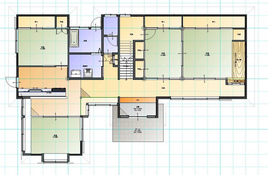 奥様のご希望の京町テイストを取り入れてプランさせて頂きました。お子様が4人いらっしゃる大家族なので、旧キッチンの位置を移動して、二間続きの客間と広縁があった日当たりの良い場所に移動して22畳の広々LDKに間取り変更致しました。こだわりは、床は杉の浮き作り材(素足で歩くと足触りが良いですね) 建具は奥様デザインの造作建具と家具を制作して、太鼓梁を2か所設置致しました。また 玄関ホールや水廻りの建具や家具も造作頂き、取手金具までお選びいただきました。その他4部屋の居室も窓を付け直しや内装張替 広々収納作成などまで行わせて頂きました。