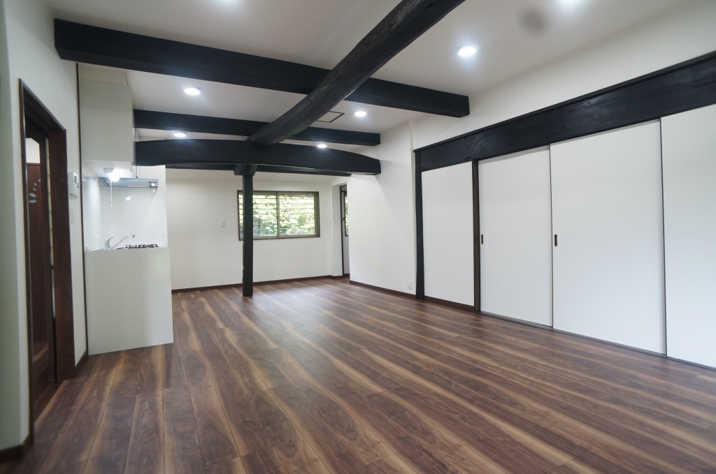 完成後、リビングからの掃き出し窓から見える庭の植栽の緑が古民家の内装とマッチして絵画の様にとても綺麗に映り込んだ事が印象的でした。T様有難うございました。