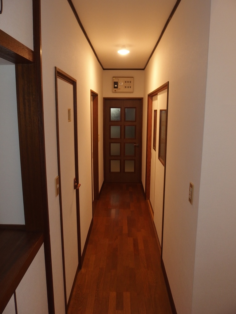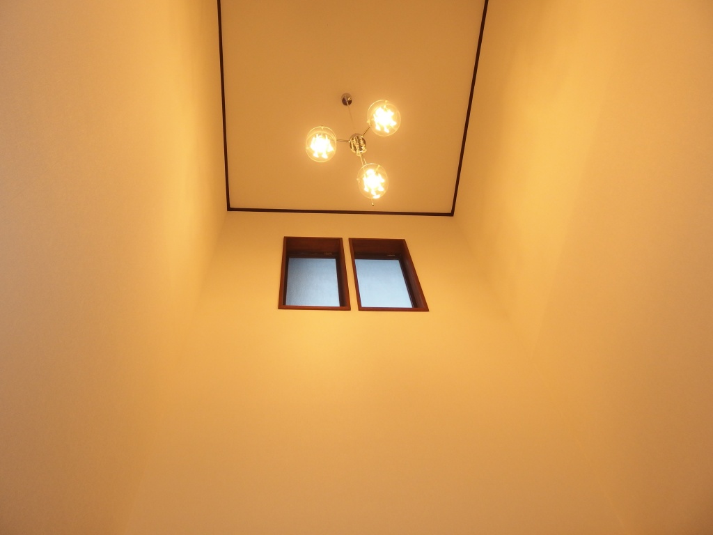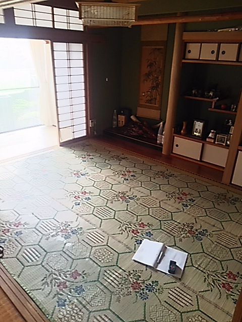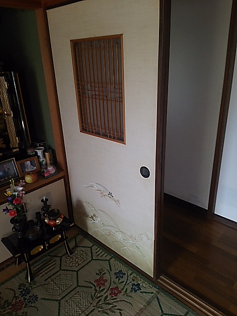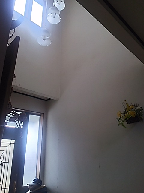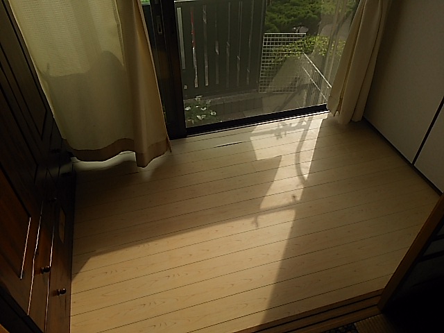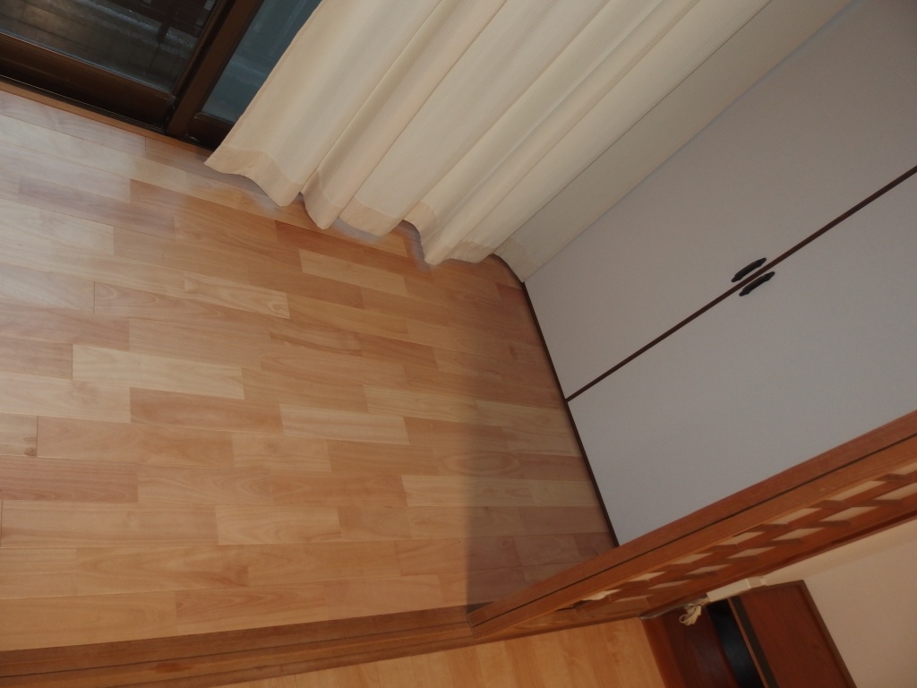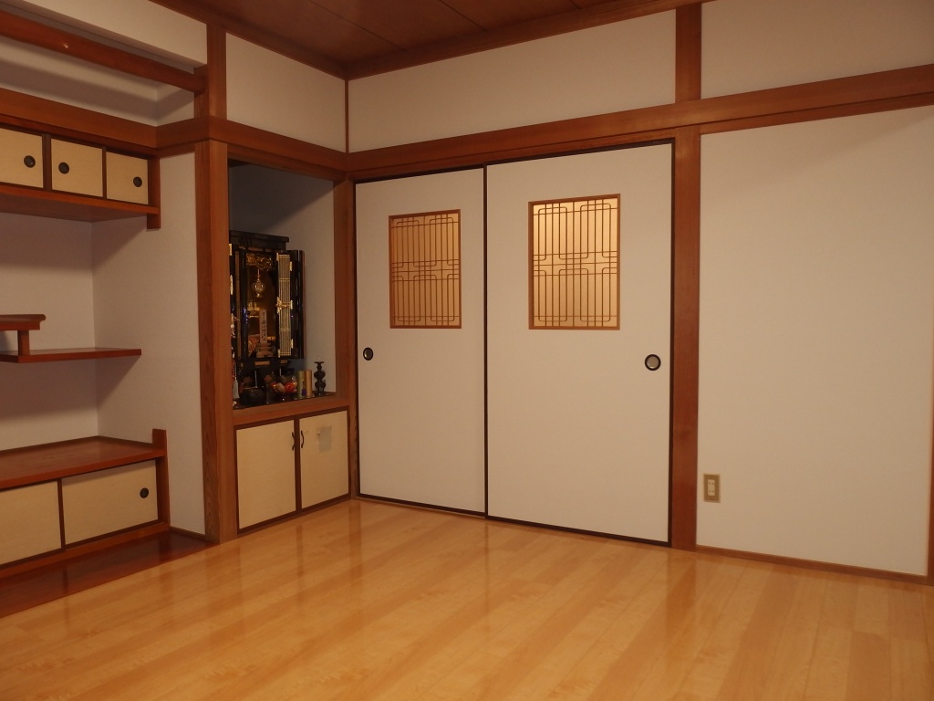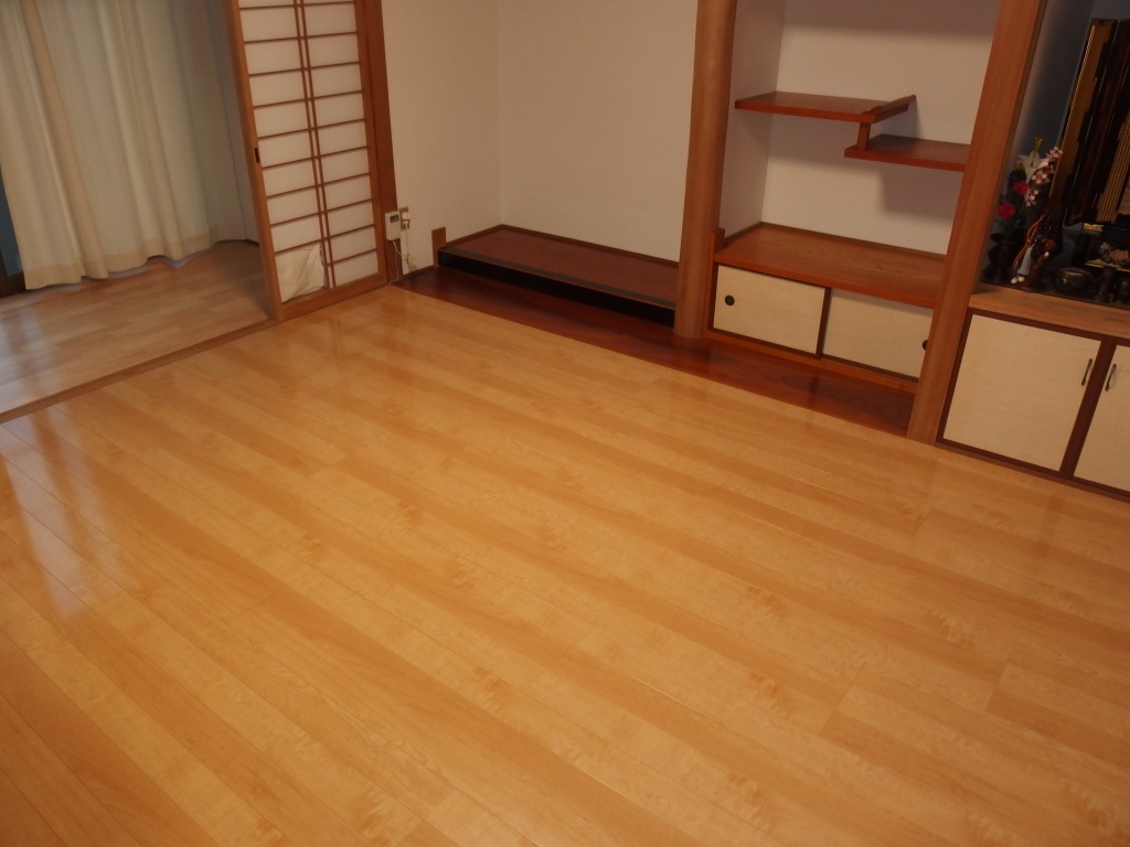 キッチン・リビングの床が所々たわみが見られるとのことで、床はフロア合板(東洋テックスダイヤモンドフロア)の上張り、和室は壁紙張替え、追加工事で玄関ホールの天井・壁の壁紙張替えまで工事をさせていただきました。キッチンの床は真ん中あたりが15㎜ほど下がっていたので慎重にジャッキアップし、床下の束柱に隙間ぶんのかませ物をして、なるべく床を水平に戻しました。縁側は日差しが良くあたる場所なのでフロア合板ではなく、サクラの無垢材を施工しました。玄関ホールは吹き抜けで天井まで約6mの高さがあり、足場を設置して壁紙の張り替えをしました。