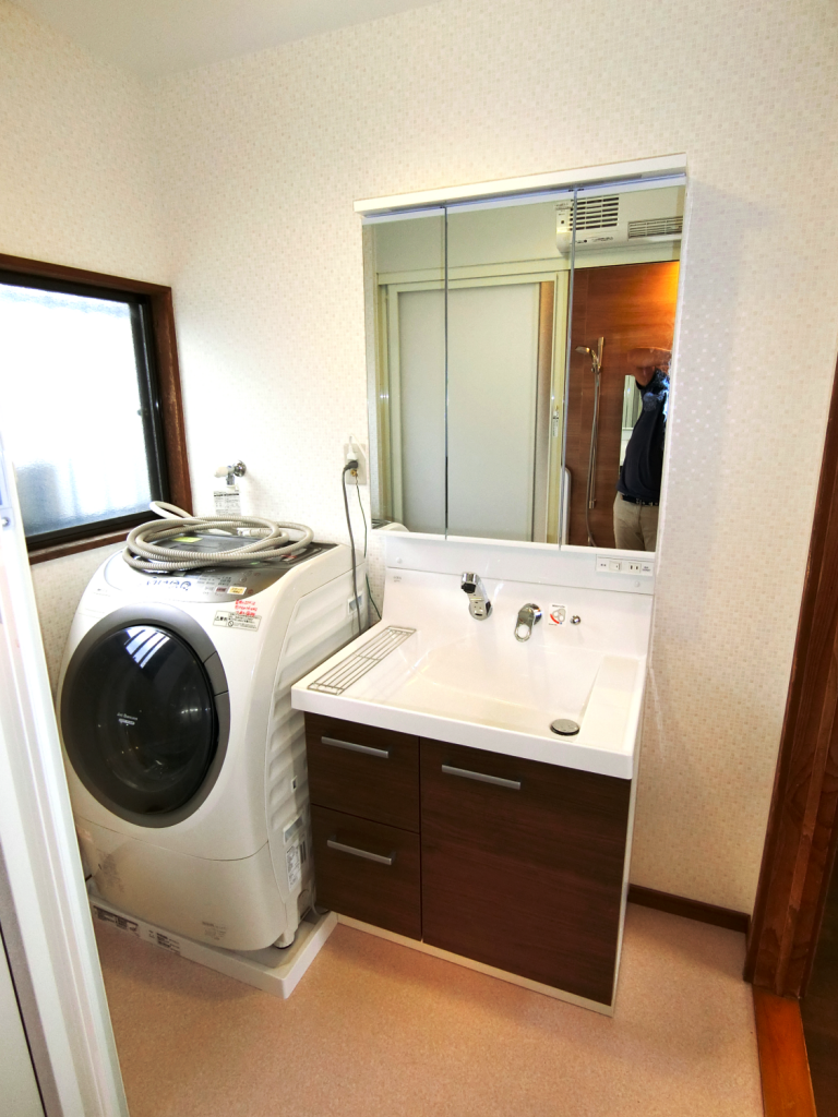 また、洗面室は内装を綺麗にして 洗面化粧台を〝リクシルのピアラ〟に取替えて、収納を多くしたいとのご要望でしたので、上部に三面鏡と下部は引出タイプを選定いたしました。