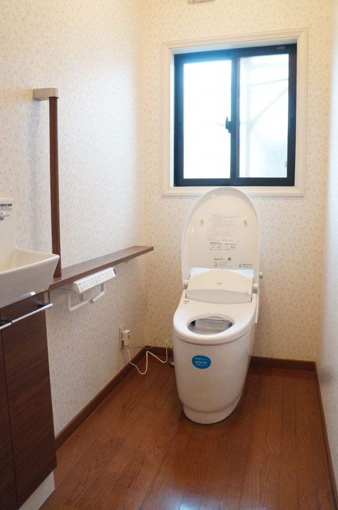 もともと付いていた収納を反対側に変え、新たに カウンター・手摺り・収納付の手洗い器を設置しました。手摺りを付けたい希望の位置に壁下地がないことが多いので、下地補強の工事も必要でした。