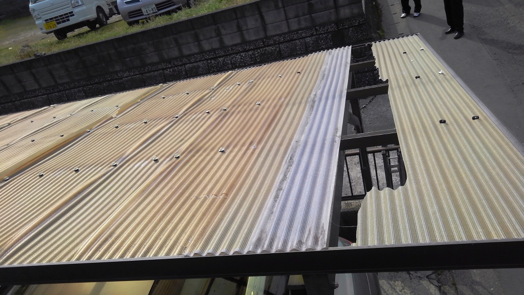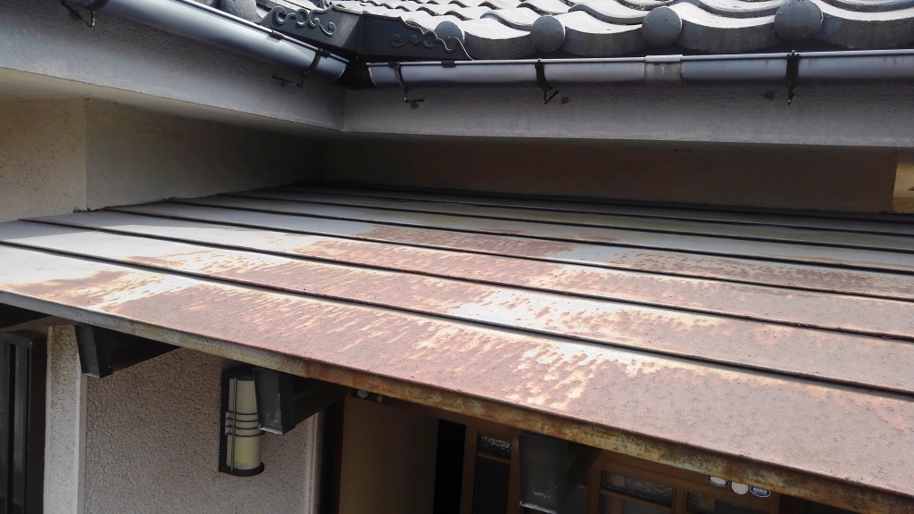 • 私が幼いころよりお世話になっているご近所のT様。玄関ポーチ屋根がひどく錆びて来たということで新しくガルバリウム鋼板への貼り替えをさせて頂きました。建てられてから約40年、長く持ったほうだと思います。解体してみるとトタン屋根だけでなく下地もかなり腐朽していましたので、屋根垂木のみ残して下地からやりかえました。ポーチの柱は塗装をし直し、これからも長く安心して頂ける工事ができました。駐車場の波板はポリカーボネード素材の波板に取り替え、固定するフックもプラスチックではなくステンレス製のもので施工しました。
