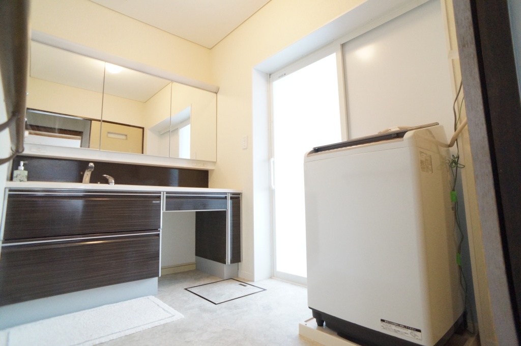 出窓の奥行が大きくユニットバス設置する為、窓設置面を出窓外壁から内側に凹みを付けて設置しました。