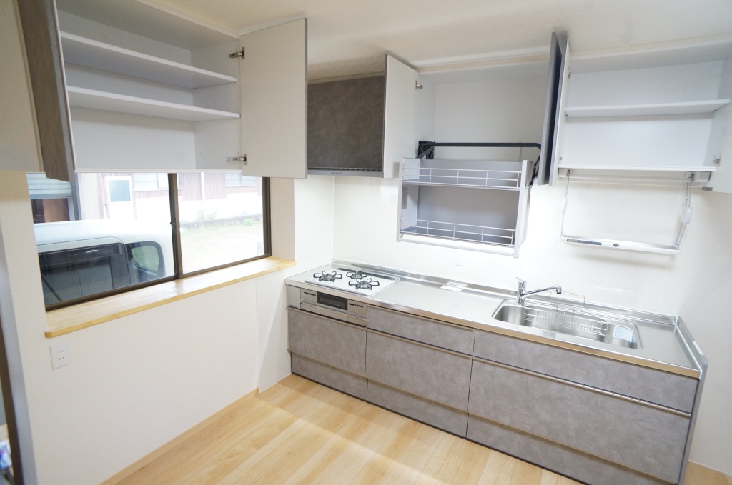 キッチンは収納を多くするために、吊り棚に「ウォールキャビネット」「ダウンウォール付ウォールキャビネット」を付属しました。