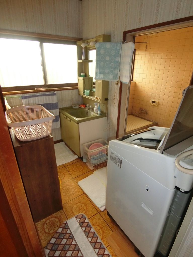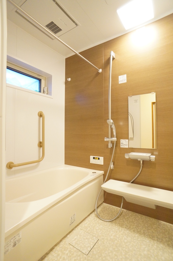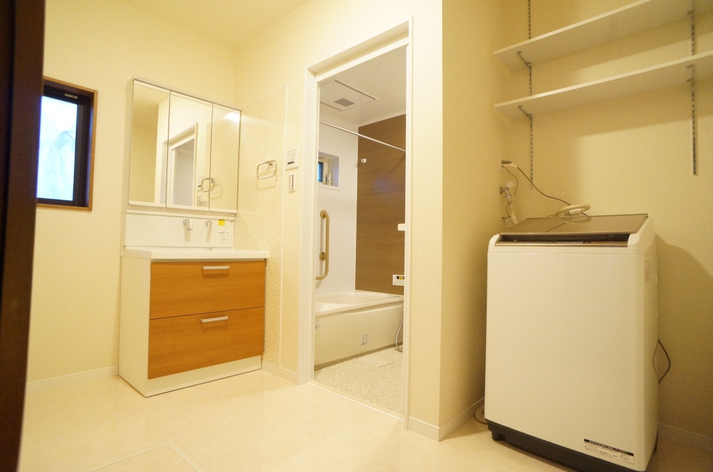 を採用しました。 アクセントにテレビ部背面に、間接照明とアクセント壁紙を設置しました。浴室と洗面所は、洗濯機の位置などが気にっておられまして、洗面スペースの間取りを変えて、窓も通り沿いの為、気にならない様に