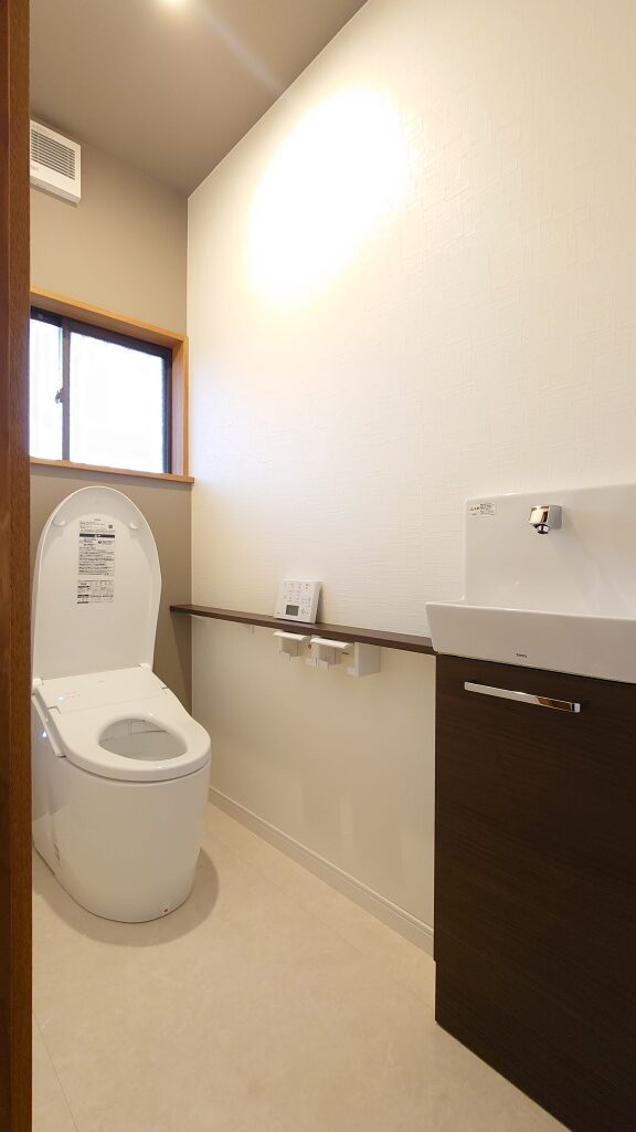 トイレは、除菌水でメンテナンス対応してくれるネオレストを採用で床は、床も汚れに強くシミになりにくいハピアフロア トイレタフ石目柄