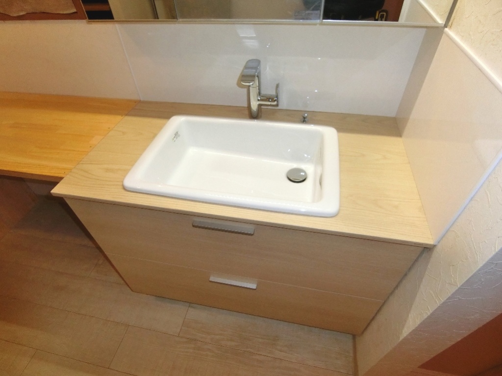 - OBのN様より、洗面化粧台が古くなってきたので相談したいと、お問い合わせくださいました。 N様のご要望は、おしゃれな家具調タイプの手洗いが欲しい、開戸よりは引き出しタイプ、 手洗い陶器はベッセル式ではなく広深タイプのボウル。洗面台の横に簡単なカウンターがほしいとの事でした。 お客様の要望に近いTOTO洗面化粧台ドレーナをご提案しました。ドレーナの木目調タイプは天板と扉は同色で統一コーディネートしました。 カウンターは造作して、洗面化粧台と同じ高さにして使い易く仕上げました。 N様にも喜んでいただきました。 この度も弊社をご利用いただき、誠にありがとうございました。
