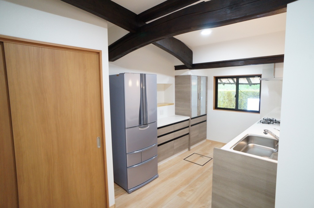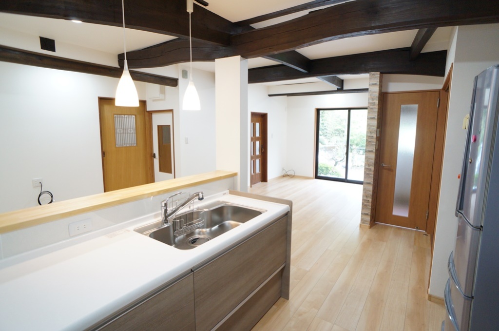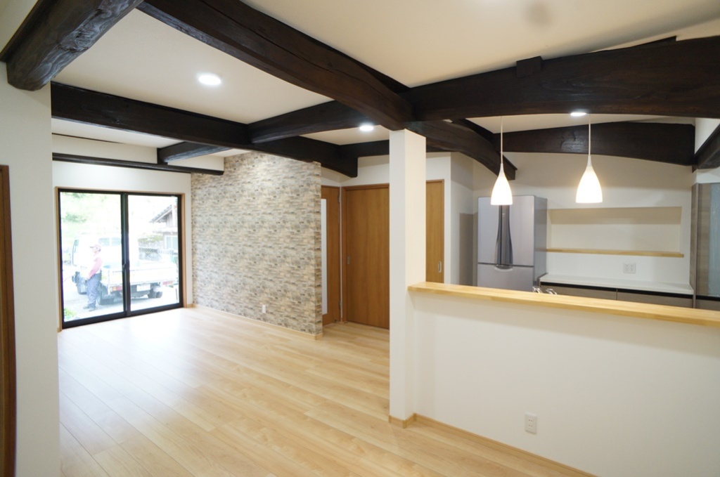 - 古民家の間取りの使い勝手を良くしたい、天井が低い、暗いなどお悩みの中、ご相談頂きました。古民家の柱と梁を考慮させて頂き、プラン作成しました。 19.6畳のLDK、対面キッチン、造作収納など作成しました。天井を上げると、古民家特有の太鼓梁が見えてきました。内装も考慮して良い仕上がりとなりました。 寒い山間の地域であるため、断熱材も考慮し、リビング側の窓取り替えも行いました。Ⅿ様、この度は弊社をご利用下さり誠に有難うございました。