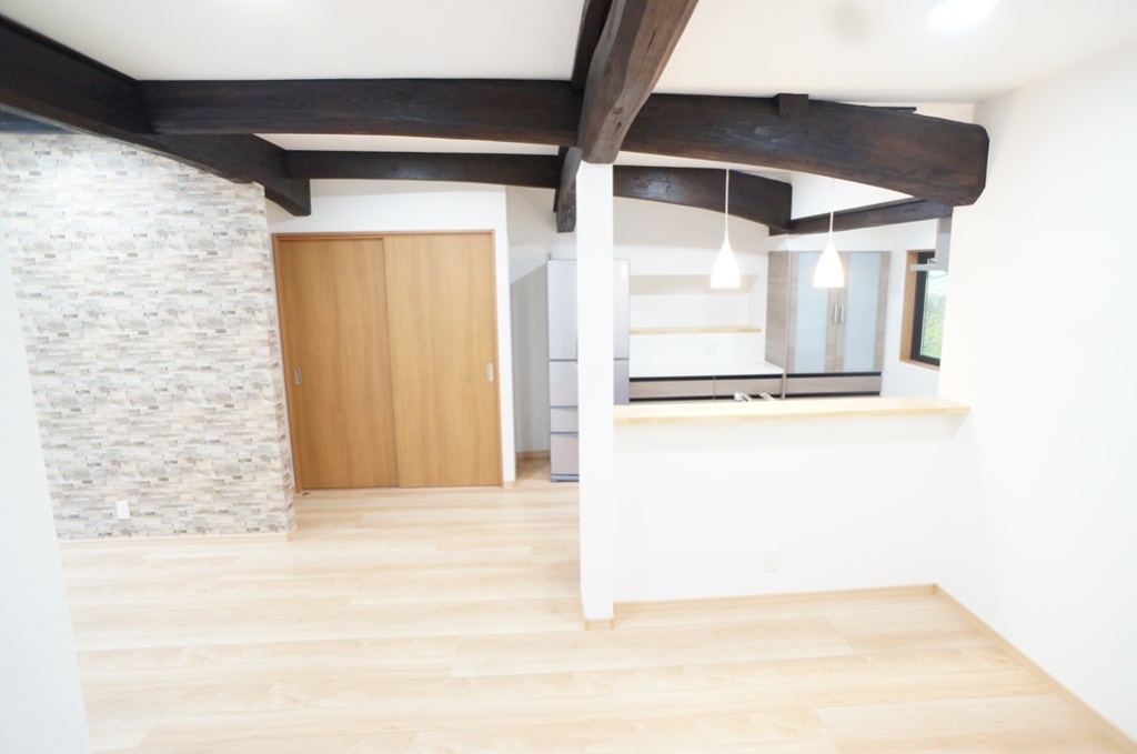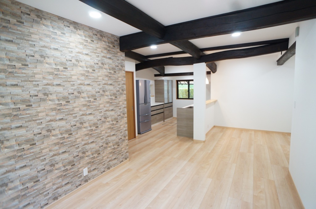 間取りを変更して、太鼓梁が見せて素敵なLDK空間。鹿児島県霧島市溝辺町M様邸 古民家LDK改装19.6畳