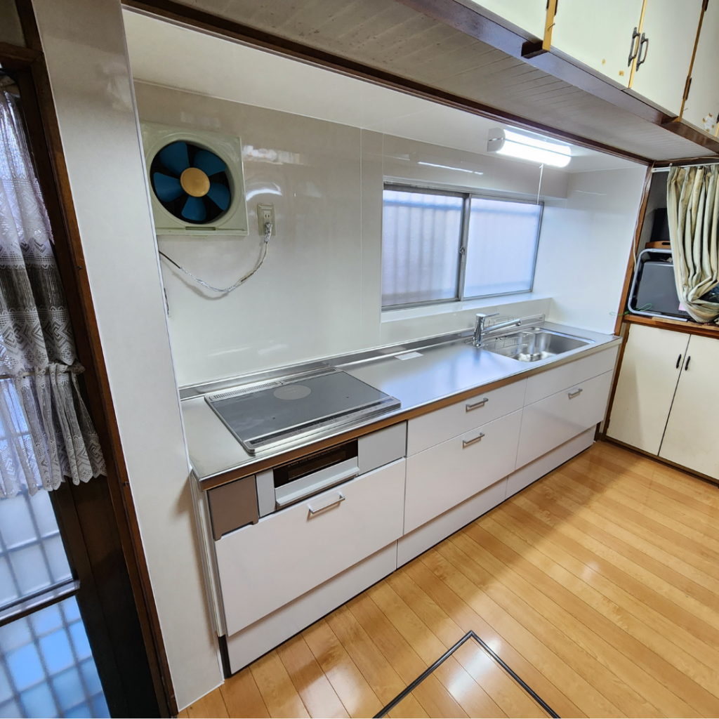 リクシルのシステムキッチン シエラの設置工事を担当させていただきました。お客様からのご要望により、既存のキッチンをシステムキッチンへとリフォームしました。家の構造上、既存のレンジフードはそのまま使用する形となりましたが、キッチンのサイズを2700mmから2500mmにサイズダウンし、IHクッキングヒーターを導入しました。これにより、使い勝手が向上し、よりスッキリとまとまりのあるデザインに仕上がりました。