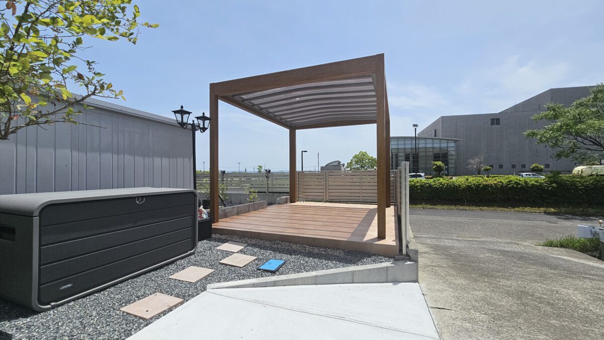 古い倉庫を解体し、タイルデッキとタカショー製のパーゴラ屋根「ホームヤードルーフⅡダブル」を設置しました。使用した材料は、タイルデッキ(耐久性が高く、見た目も美しいデッキスペースを提供)とパーゴラ屋根(日差しを遮りつつ、開放感を保つデザイン)。施工後は、ブラウンEの色合いが庭に自然に馴染み、快適なアウトドアスペースが生まれました。家族や友人と過ごす素敵な時間を提供できるようになりました。