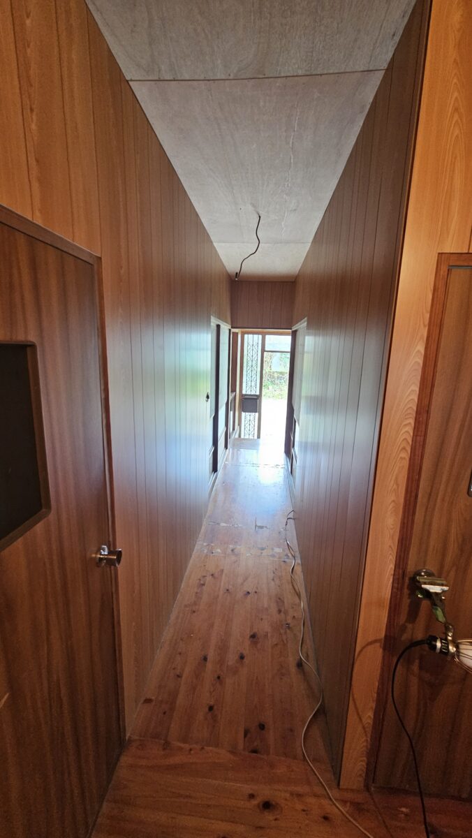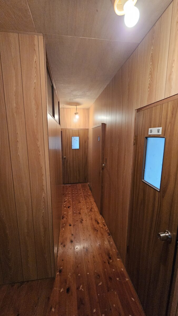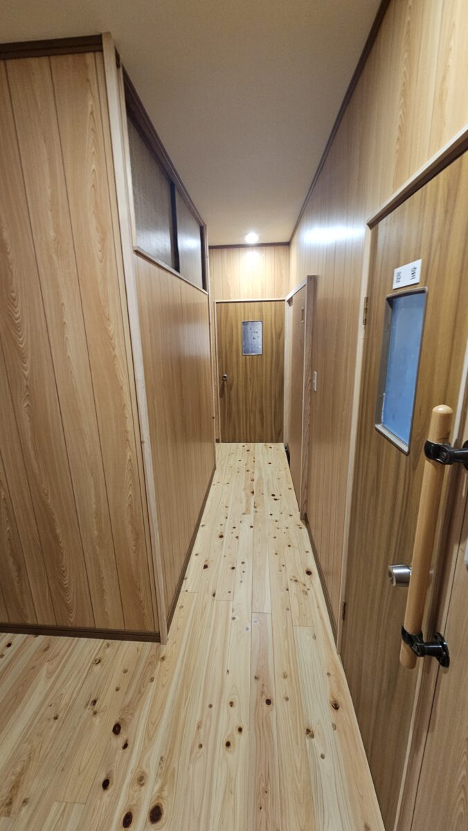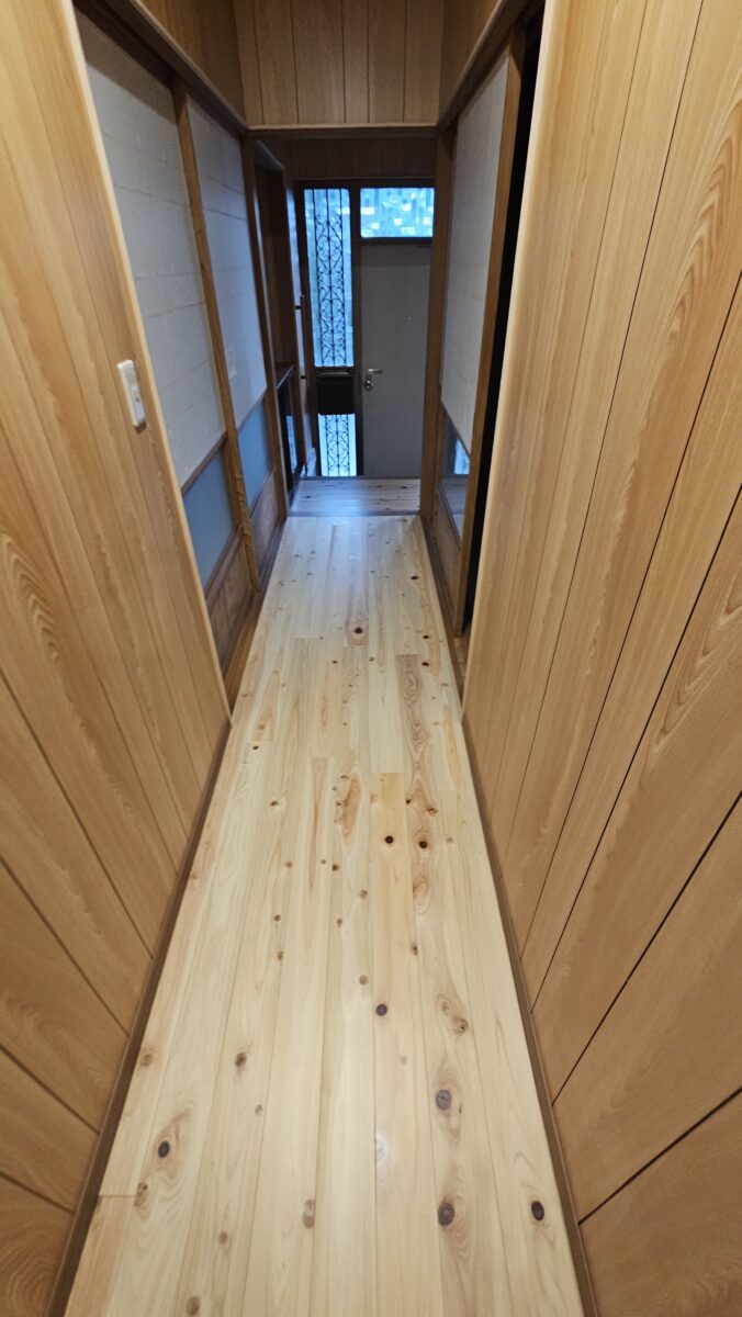 廊下の木目が暗く、壁材が剥がれているなどの劣化が見られたため、内装のやり替えを行いました。床部分では、ドア敷居の段差を解消するために、ヒノキ材を上張りし、歩きやすさと安全性を向上させました。天井はべニア下地に壁紙を貼り、明るく清潔感のある仕上がりに。壁には明るい木目のプリントべニアを貼り、耐久性と美観を兼ね備えた空間へとリニューアルしました。これにより、廊下全体が明るく快適な空間へと生まれ変わりました。
