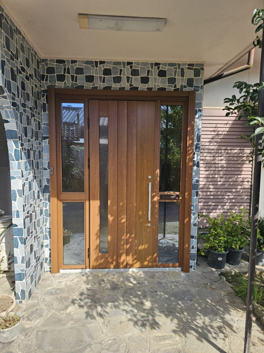 玄関ドアの老朽化に伴い、カバー工法を用いてドアを取り替えました。新しく設置したのは、YKKの「ドアリモ」手動錠タイプで、LOW-Eガラスを採用した断熱性の高い仕様です。カラーはショコラウォールナットを選び、高級感と温かみのあるデザインに仕上げました。カバー工法により短期間で施工を完了し、機能性とデザイン性を兼ね備えた玄関へとリフォームしました。