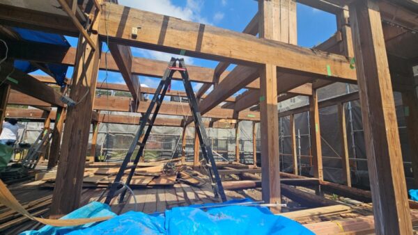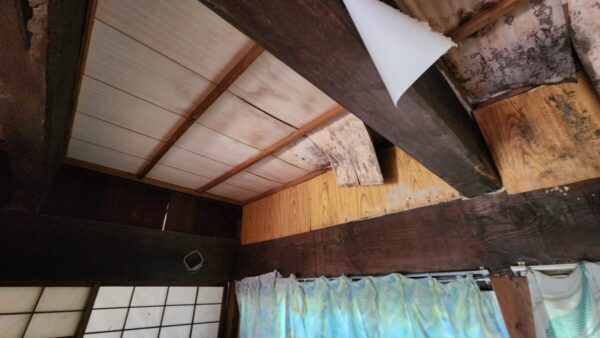 台風被害や老朽化により、屋根が一部崩れ、雨水が浸入していました。その結果、柱や梁が劣化し、建物全体の構造に影響を及ぼしていました。