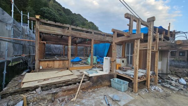 古民家再生の最初のステップは、建物を骨組みだけの状態にするスケルトン解体です。