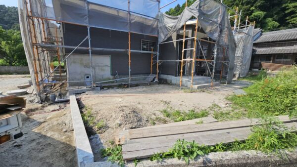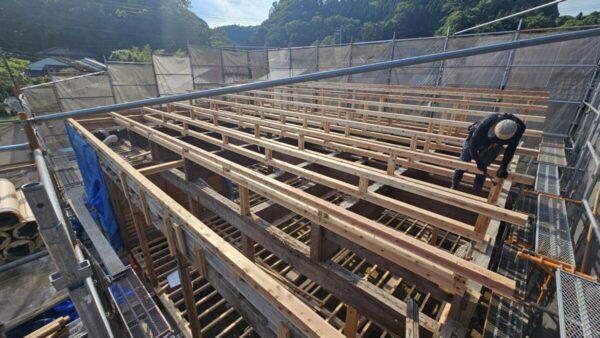 屋根工事が完了した後は、建物の外観を整える外壁工事に取り掛かりました。床下地の木工事も進行中です。