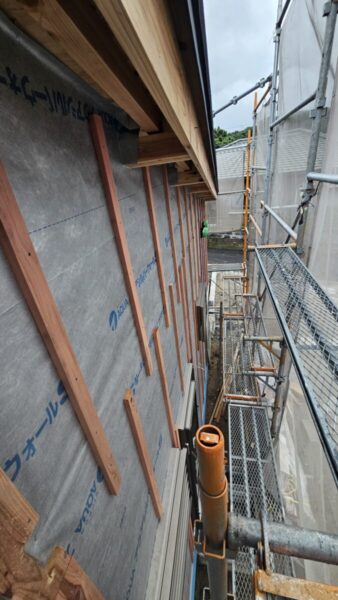 防水シートを設置した後、外壁材を固定するために胴縁(どうぶち)を取り付けます。