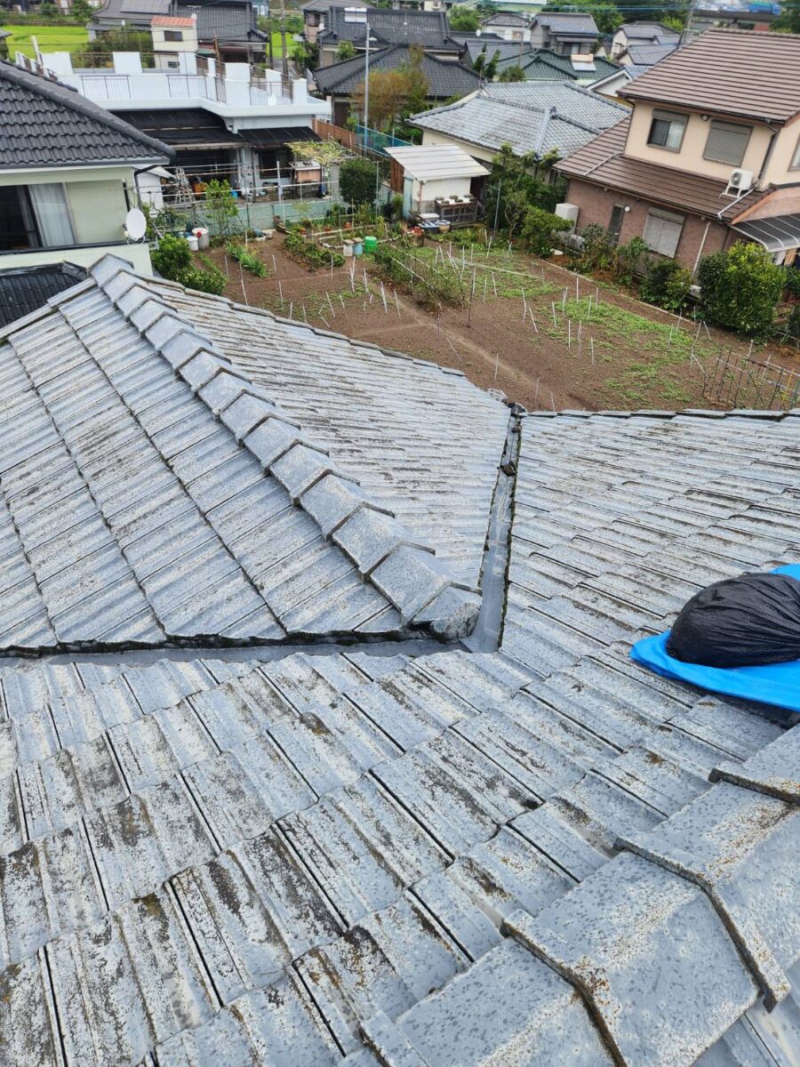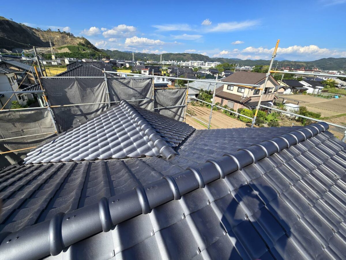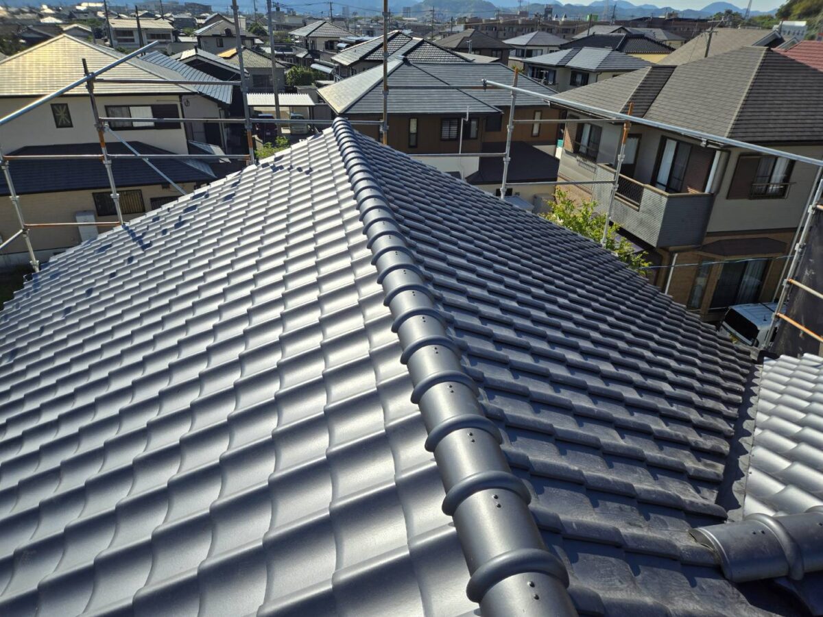 今回は台風による雨漏りの修繕で、既存の瓦が廃盤となっていたため、陶器瓦と金属屋根のどちらにするか迷われましたが、最終的に「三州陶器瓦 和型 エース(銀輪色)」をお選びいただきました。耐久性とデザイン性に優れた瓦で、T様邸の外観にも非常にマッチした仕上がりとなりました。