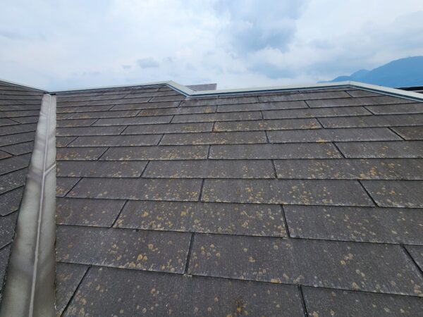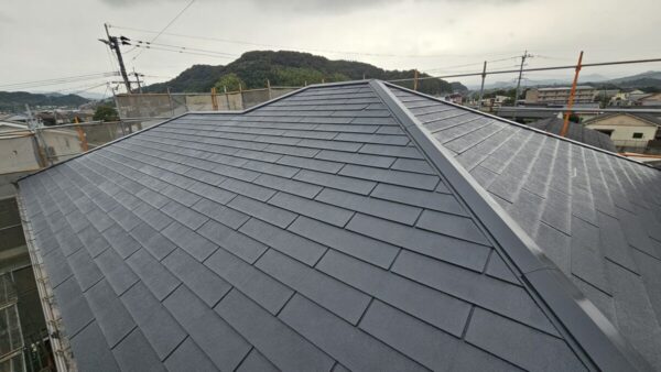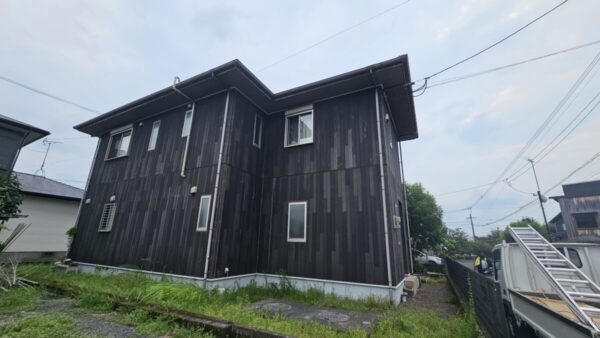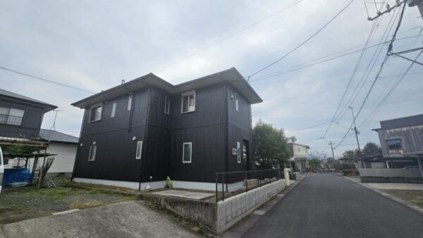 屋根はコロニアル専用の下塗り材を塗布した後、ハイパーユメロックをアイアングレー色で中塗り・上塗りの2回塗りで仕上げました。鹿児島特有の強い日差しや火山灰の影響を受けやすい屋根に対し、耐候性と防水性を高める塗料を選定しています。落ち着いたダークグレー系の色味で、外壁との相性も良く、住まい全体をぐっと引き締める印象になりました。