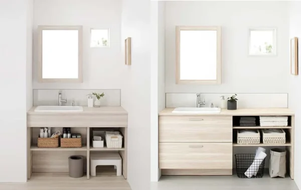 などから選べ、どちらも鏡の裏が収納スペースになっています。