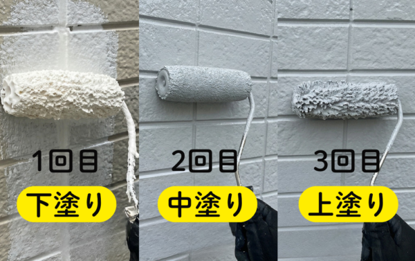 当社では、すべての外壁塗装工事において丁寧な3工程塗りを徹底しています。この工程は、以下の3つのステップで構成されています。