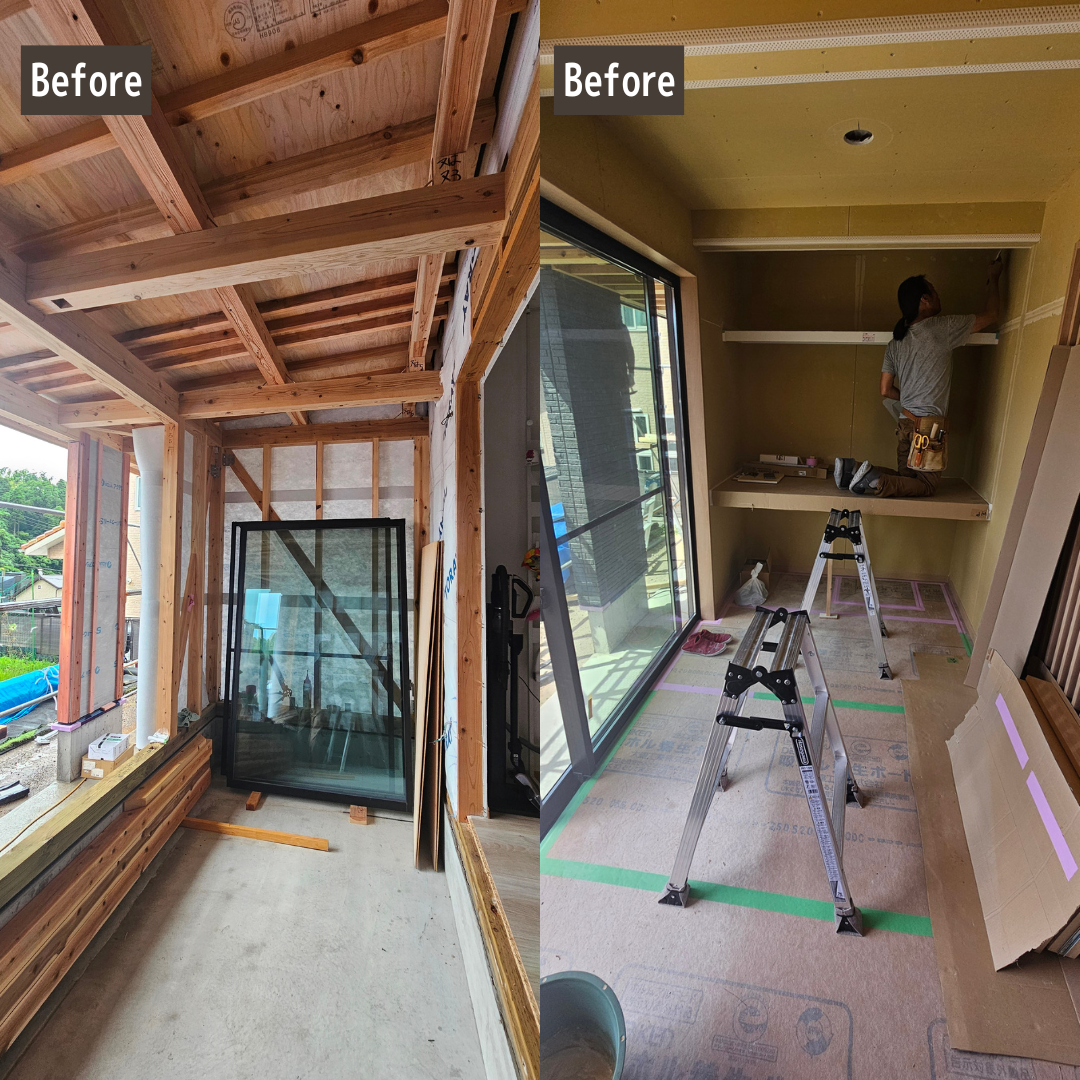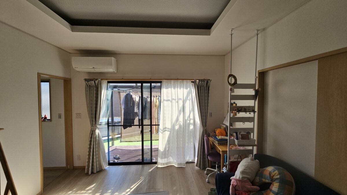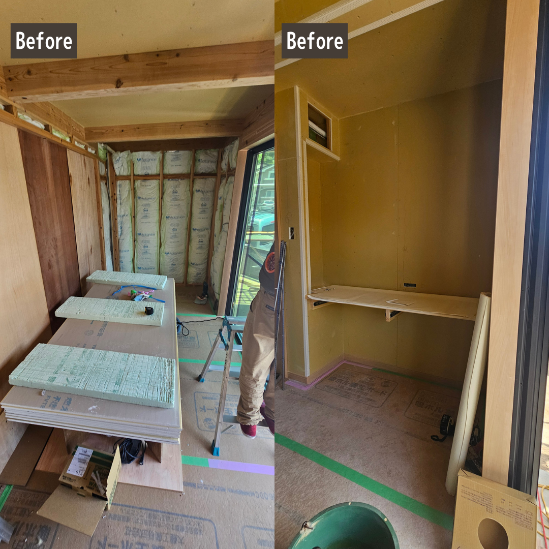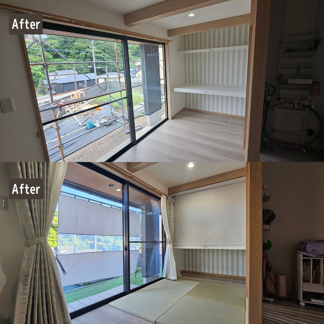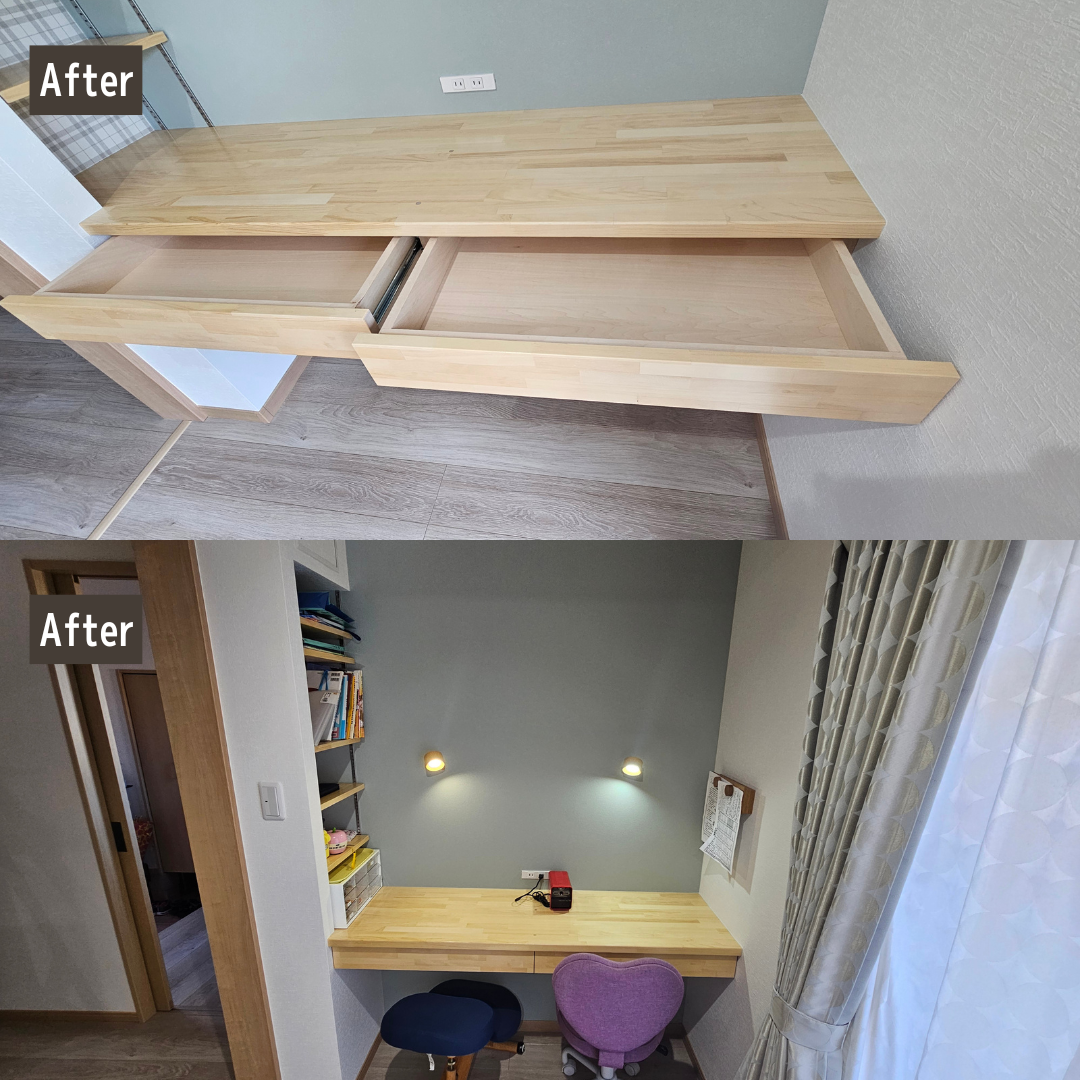 - 今回の鹿児島市K様邸の増築リフォームでは、お子様の勉強スペースと収納、屋外土間を一体的に計画することをテーマにしました。 造作カウンターと引き出し収納、可動棚を組み合わせることで、限られたスペースでも使いやすい勉強コーナーと収納スペースになるようプランしています。 収納スペース前には置き畳を設け、お子様の遊び場やごろ寝、家事の合間にひと息つける場所として活用できるようにしました。物干しスペースの目の前にあるため、洗濯物をサッと取り込んでその場で畳める家事ラク動線にもなっています。 屋外土間は、洗濯動線の短縮や物置スペースの確保を意識して計画しました。 大切なお住まいの増築工事をリフォームニシキにお任せいただき、誠にありがとうございました。