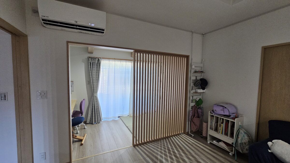 もともとリビングの壁に付いていた窓の部分を、増築工事に合わせて「部屋同士をつなぐ開口部(出入口)」として活用しています。 リビングと新しくできた居室との間には格子を設けて、ゆるやかに仕切る「半目隠し」のデザインにしました。 格子によって視線は適度に抑えつつ、光と気配は行き来できるようにし、 リビングと増築した空間がほどよくつながるような計画としています。