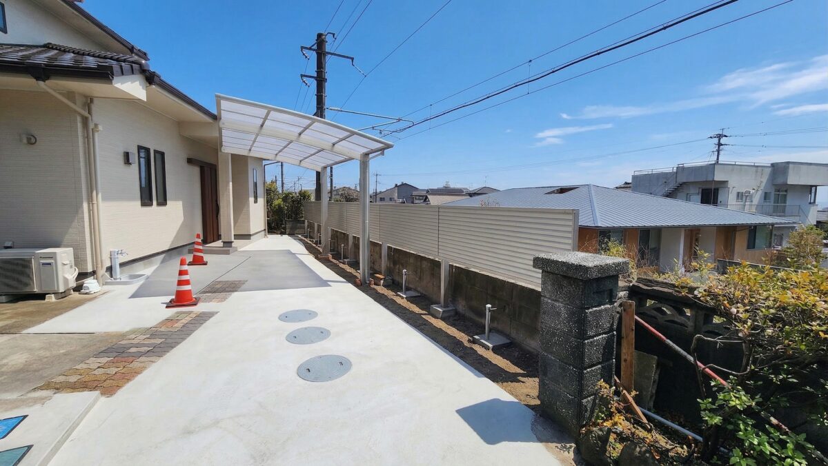 姶良市T様邸にて、カーポート新設と目隠しフェンス設置のエクステリア工事を行いました。「雨に濡れずに玄関に入りたい」「風が強い場所なので柱は頑丈にしたい」というご要望に合わせ、Daisenカーポート「リアルポートⅣ 24-50」に補助柱を追加し、建物ギリギリまで寄せて設置することで、雨の日でもほとんど濡れずに玄関へ行ける導線と十分な強度を確保しました。フェンスはYKK「シンプレオフェンスYL1型 高さ80cmタイプ」を採用し、圧迫感を抑えながら目隠しと防犯性を両立、柱基礎はモルタル仕上げで耐久性にも配慮しています。ブロック補強と土間コンクリート打設は施主様が行い、専門工事との役割分担により、無駄を抑えたエクステリアリフォームとなりました。